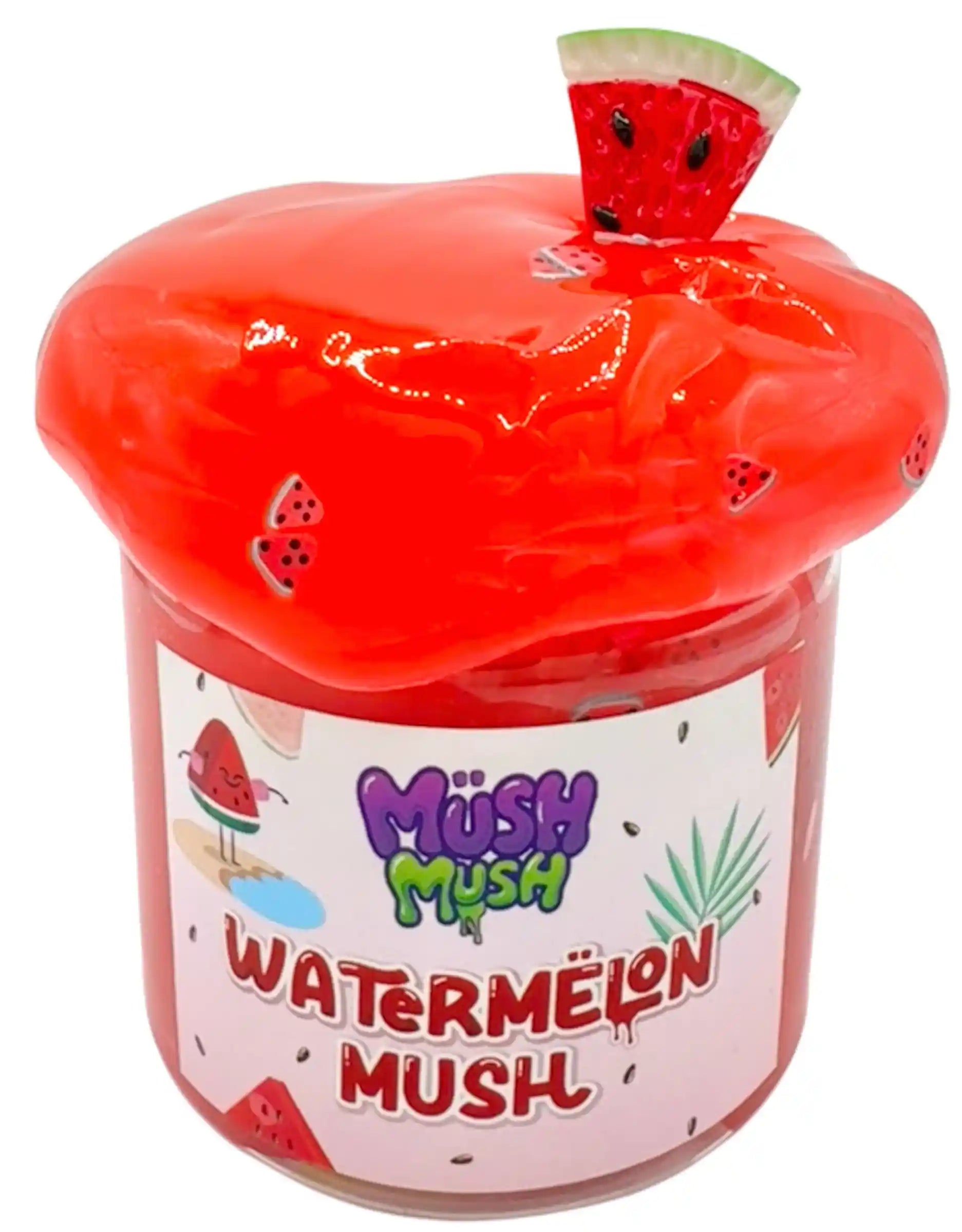 Red jelly slime with a smooth, clear texture, topped with watermelon slice sprinkles and a watermelon charm. The texture is bouncy and squishy, with a fresh watermelon scent that’s pure summer in a jar.